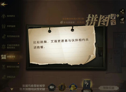 哈利波特魔法觉醒拼图宝藏9.25给出的线索是:比起跳舞,艾薇更愿意与伙伴相约共进晚餐。跟跳舞和晚餐有关的地方也就那么几个,所以就很好定点了。那么哈利波特魔法觉醒跳舞拼图在哪呢?