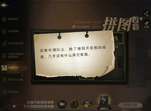 哈利波特魔法觉醒拼图宝藏9.26给出的线索是:这里布满灰尘,除了堆到天花板的纸盒,几乎没有什么其他家具。拥有很多纸盒的地方巫师们肯定见过,那么哈利波特魔法觉醒灰尘作业在哪呢?
